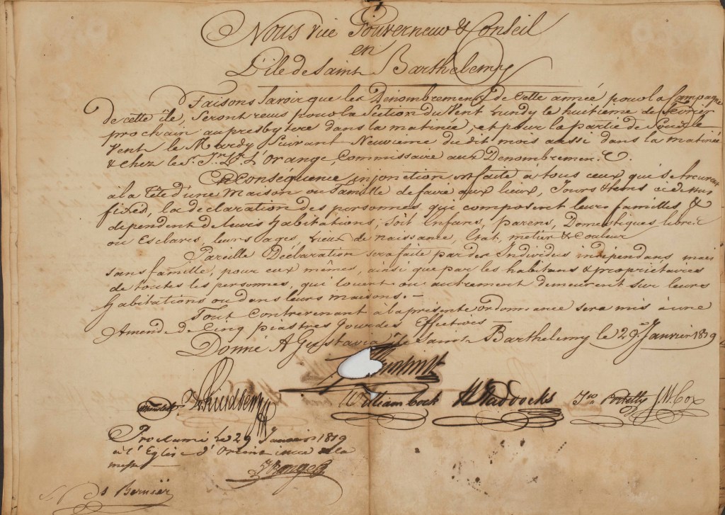 Le 28 janvier 1819, Jean Louis L’ORANGE Commissaire aux dénombrements adresse à « Monsieur le Gouverneur Président, et à Messieurs les Honorables Juges et Membres de la Cour Civile de l’île de Saint-Barthélemy » :