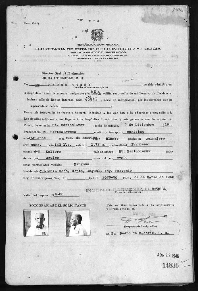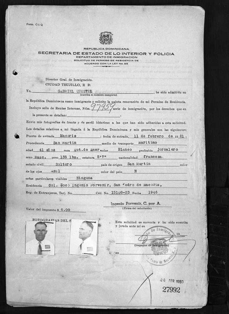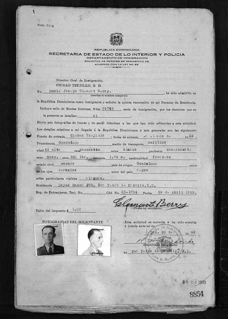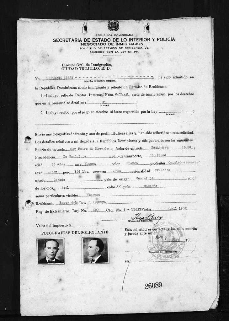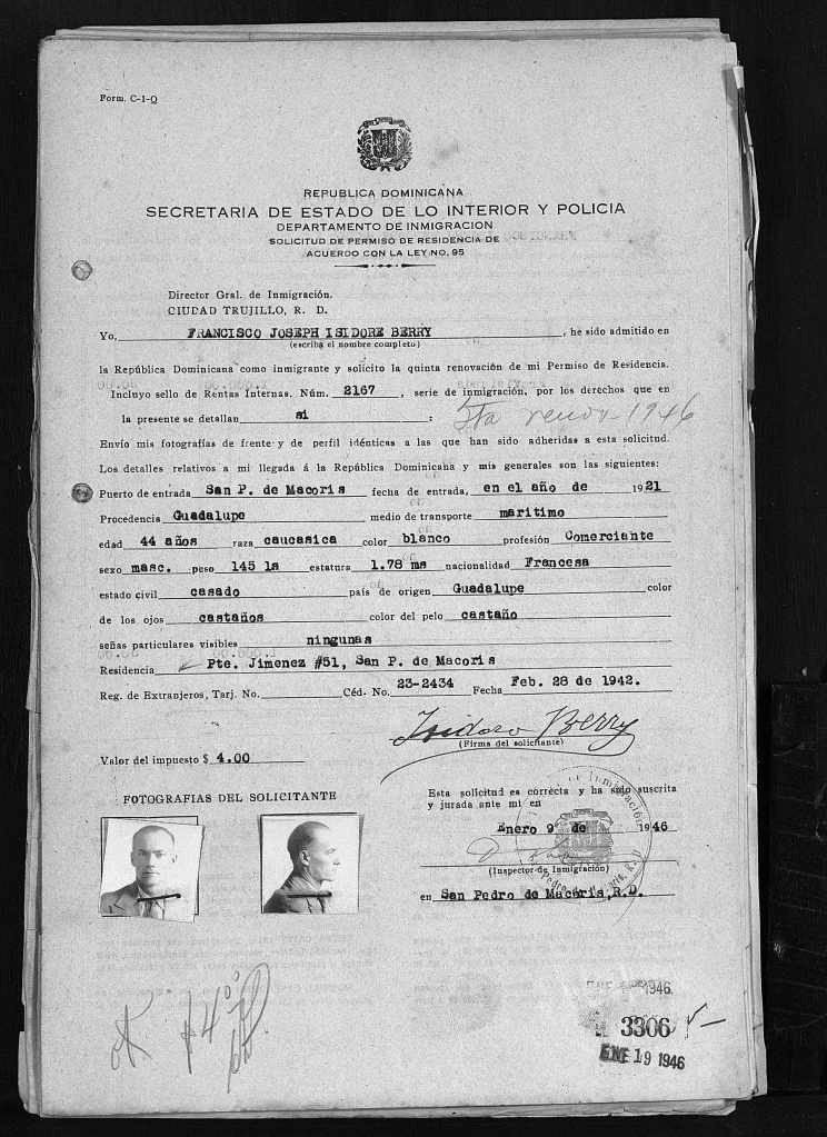 Sur ce document daté du 7 avril 1941, il est indiqué qu’il est arrivé en novembre 1923 à San Pedro de Macoris en provenance de Guadeloupe. Il est de race blanche, mesure 1.73 m, il est châtain et a les yeux bleus.