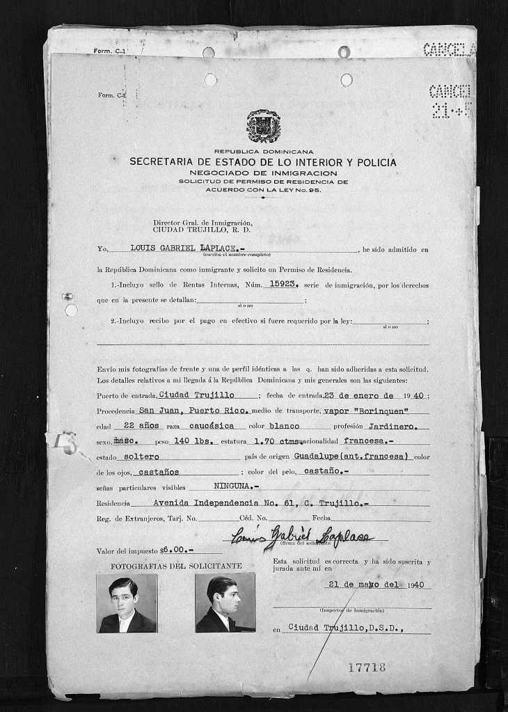 Il est né à Grand Fond le 25 octobre 1917, fils de Joseph Gabriel LAPLACE et de Delphine LÉDÉE. Il est arrivé par Ciudad Trujillo le 23 janvier 1940 et il est jardinier.