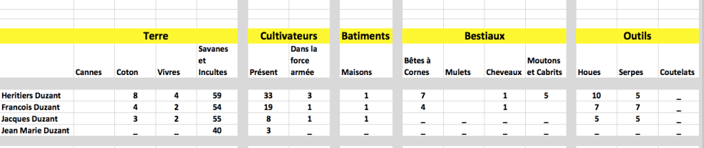Il faut ensuite attendre le « Recensement général de la population et des propriétés particulières de la partie Française de l’Isle St-Martin au 30 Germinal l’an 4eme de la République Française une et indivisible » pour en apprendre un peu plus, même si nous évoquerons des traces antérieures un peu plus tard. Dans ce recensement daté du 19 avril 1796 donc, nous trouvons quatre propriétés sous « Duzant » :