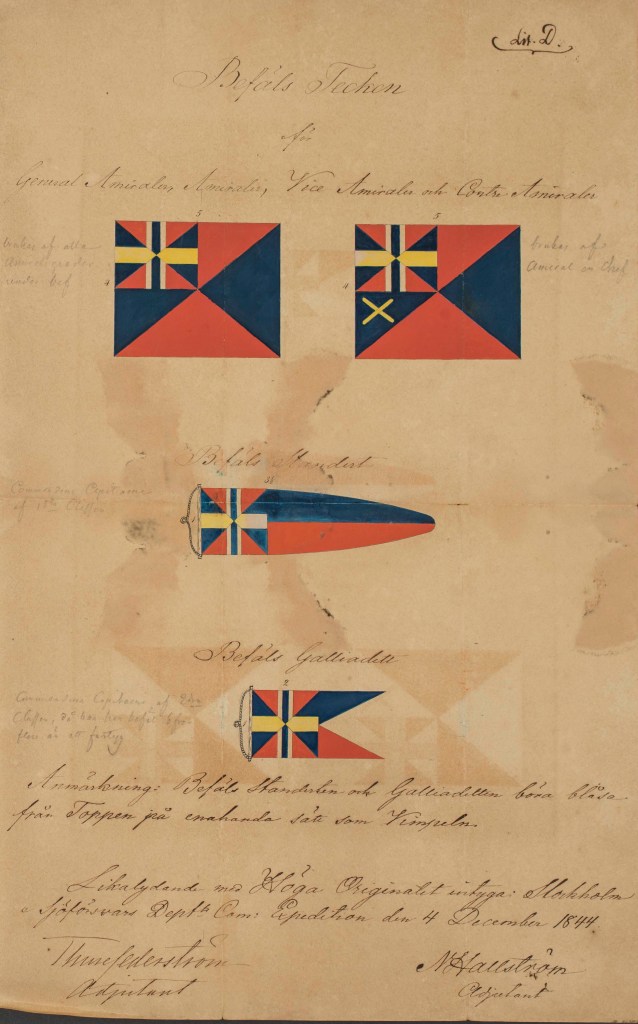 Planches représentant des modèles de pavillons de la marine suédoise en 1844 en fonction du grade du Commandant de bord.