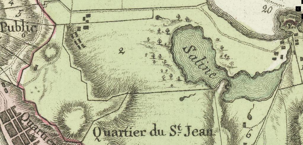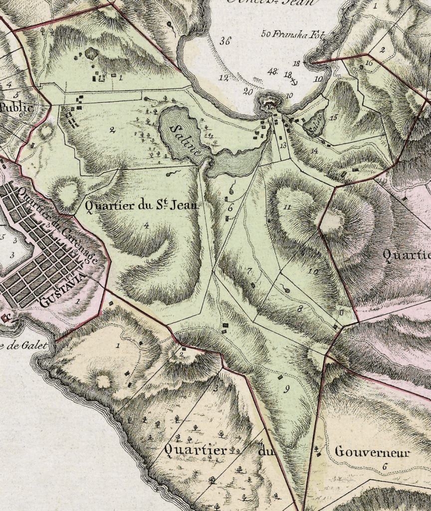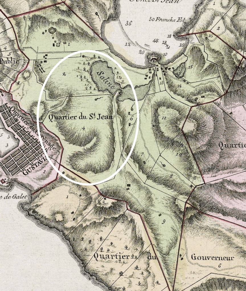 Notons tout de suite que sur la carte, on s’aperçoit que le Quartier de Saint-Jean est bordé au nord par le Quartier du Roi, qui correspond à ce que nous appelons aujourd’hui le Quartier de l’Anse des Cailles. A cette époque, la partie ouest du Quartier de Saint-Jean est également connue sous Quartier du Roi. Les habitations ci-dessus sont donc dites sises au Quartier du Roi, même si elles sont dans ce que nous appelons aujourd’hui Saint-Jean.