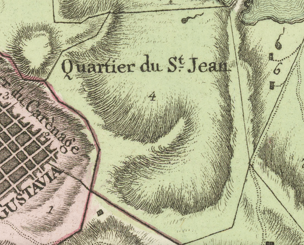 Détail de la carte de 1787 – Partie ouest de Saint-Jean borné par le Quartier du Roi – on voit les habitations 1, 2, 3, 4 et 5