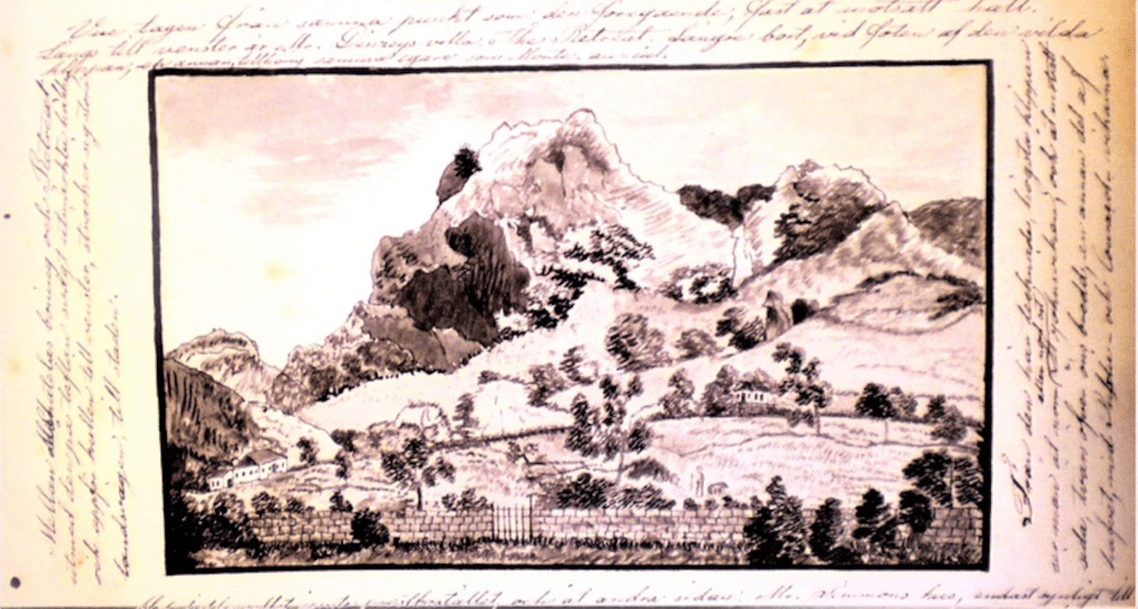 Dessin de Mademoiselle Edla URLRICH – l’habitation MONTE AU CIEL (vers 1870) – mention manuscrite de sa main « La Propriété « MONTE AU CIEL » qui appartient à Mr Chatelas,  située dans la montagne au-dessus de la baie de St-Jean. Le dessin est fait depuis à côté du gros tamarinier ici sur la gauche ».