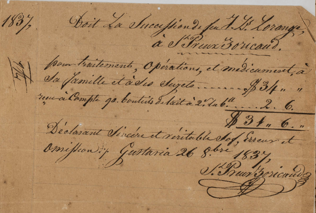 On trouve une facture rédigée de sa main le 26 octobre 1837 adressée à la succession de Jean Louis L’ORANGE. Il réclame 34 gourdes pour « traitements, opérations et médicaments à sa famille et à ses sujets » desquels il a déduit 2,6 gourdes correspondant à 90 bouteilles de lait qu’il avait achetées à L’ORANGE et mises en compte, soit une balance de 31,60 … (il ne devait pas être très bon en mathématiques).