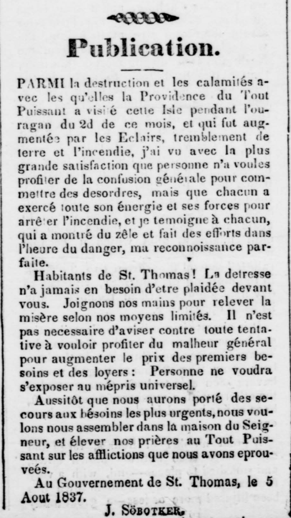 1. « il n’y a pas un mot sur la situation des esclaves à la suite de l’ouragan de 1837 » : quelle place avaient-ils lors de ce terrible ouragan ? L’histoire de l’abolition de l’esclavage à Saint-Barth ne se ponctuera que le 9 octobre 1847… Dix ans plus tard !