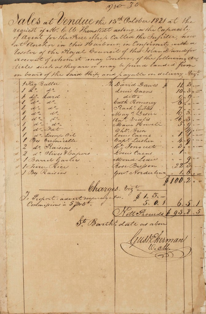 Le 13 octobre 1821, on procède à la vente aux enchères d’une partie du cargo du « Jupiter ». Il y en a une deuxième le 3 novembre. On y vend tout ce qui se trouvait à bord au moment de la prise.