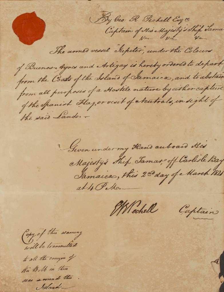 Rapport du 16 novembre 1821. « Le pirate « Jupiter » est condamné par le Conseil, et il va être vendu aux enchères publiques le 24 de ce mois pour le compte de Votre Majesté. C’est à termes, un tiers comptant, et le reste à 12 et 24 semaines contre bonne et valable caution. Les fragments trouvés à bord et dans les malles des matelots provenant du pillage du navire américain « L’Orléans » se sont vendus assez bien, mais c’était si peu de choses que j’en ai offert le montant aux propriétaires.