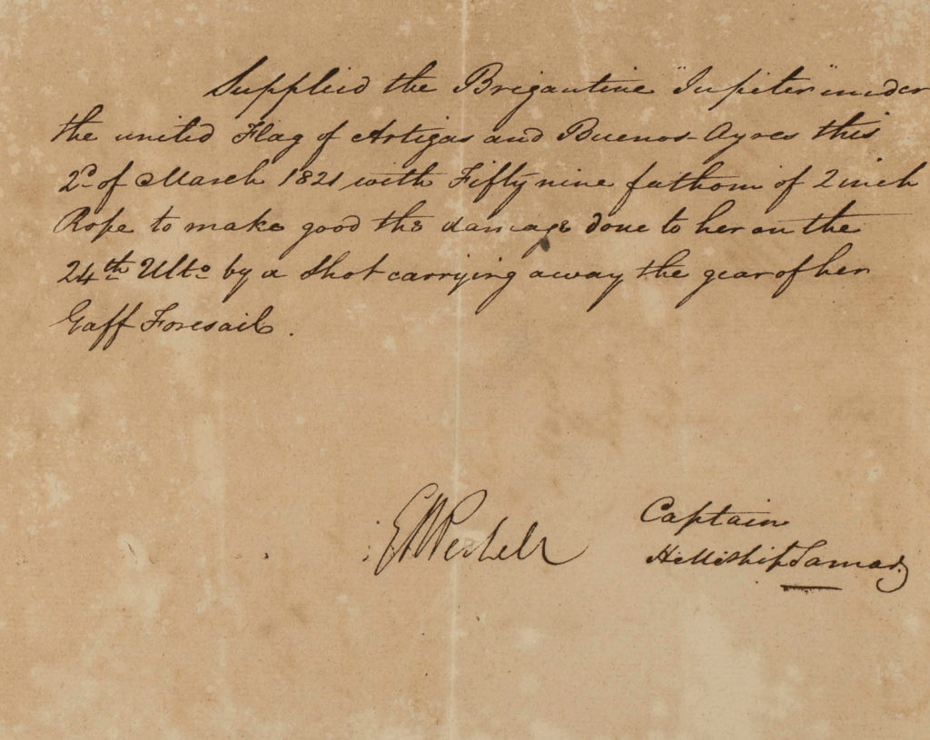 En mars 1821, la prise du « Renter » alias « La bonne mère » alias « Général Artigas » vendu, navire et marchandises pour 1150 piastres,