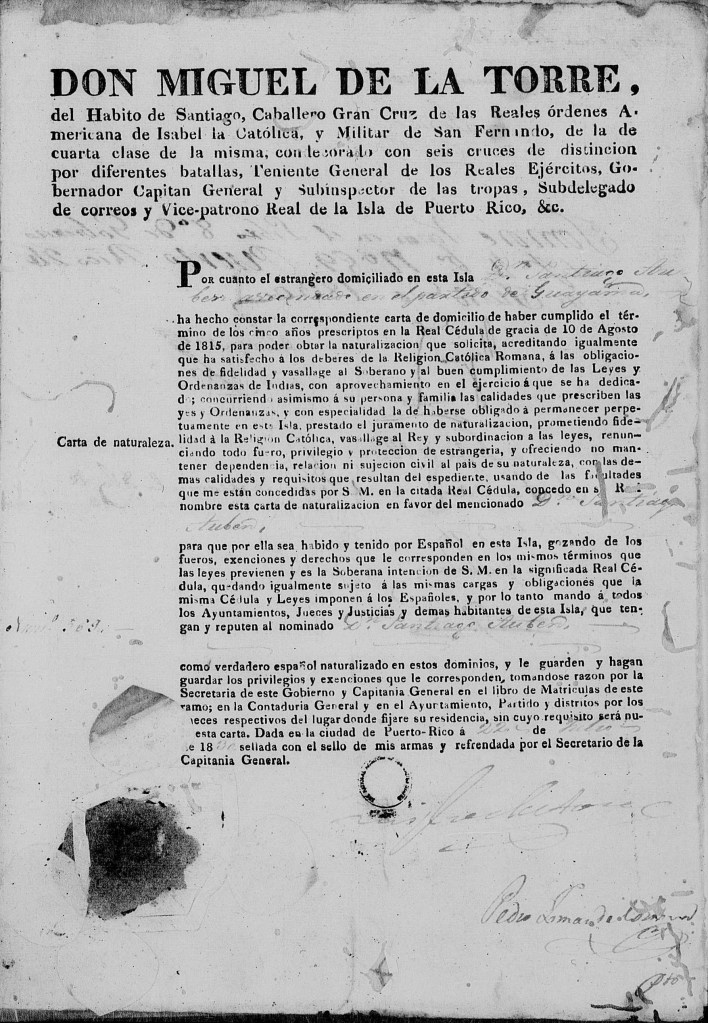 Dans sa demande de naturalisation envoyée en novembre 1831, il indique que cela fait plus de dix ans qu’il réside à Guayama avec ses parents et son frère, et qu’ils ont obtenu la carte de résidence. Son frère Santiago a été naturalisé le 22 juillet 1830. Sa demande est acceptée et il est naturalisé le 25 novembre 1831.