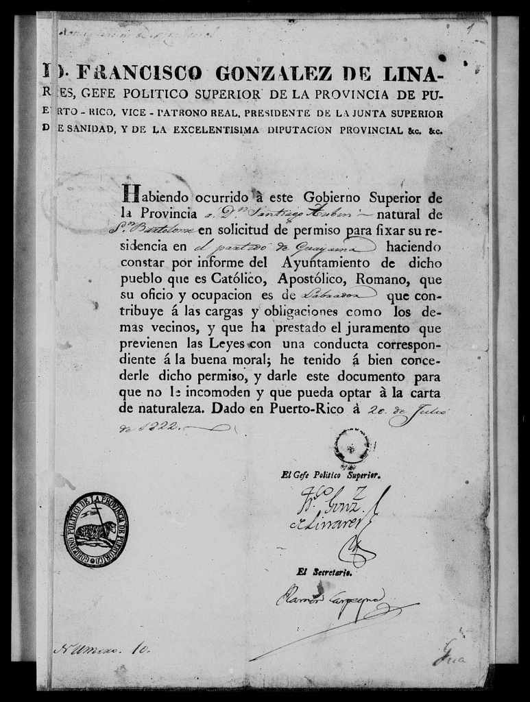Le 16 aout 1824, il fait sa demande de résidence auprès des autorités de Patillas, le 16 août 1824