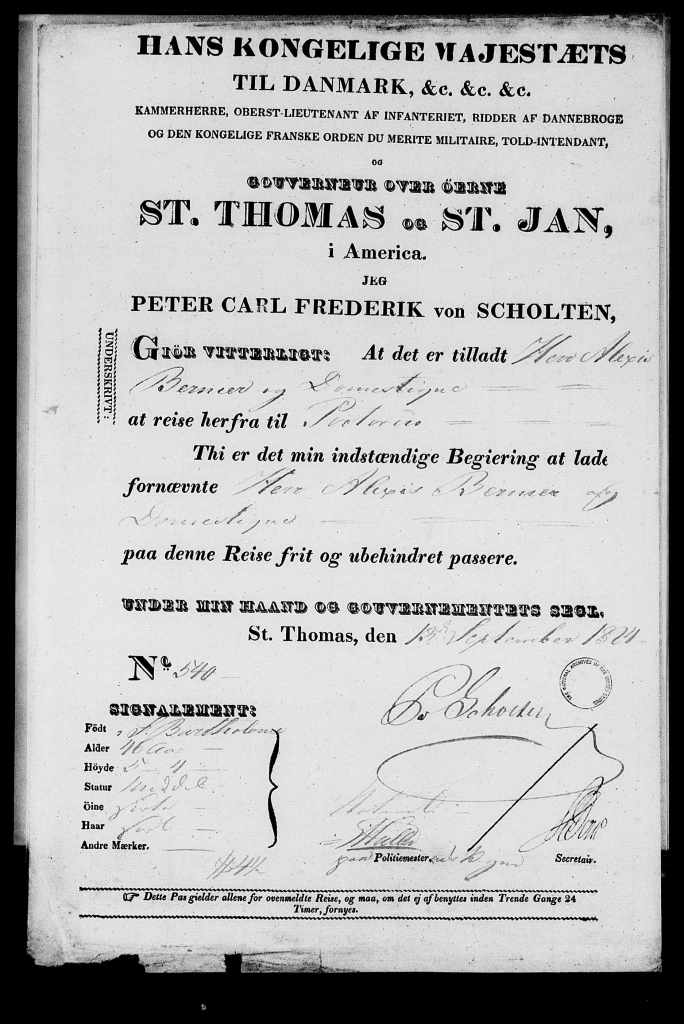 Il semble résider un temps à Saint-Thomas auparavant, car il a présenté un passeport des autorités danoises pour entrer à Porto Rico daté du 13 septembre 1824.