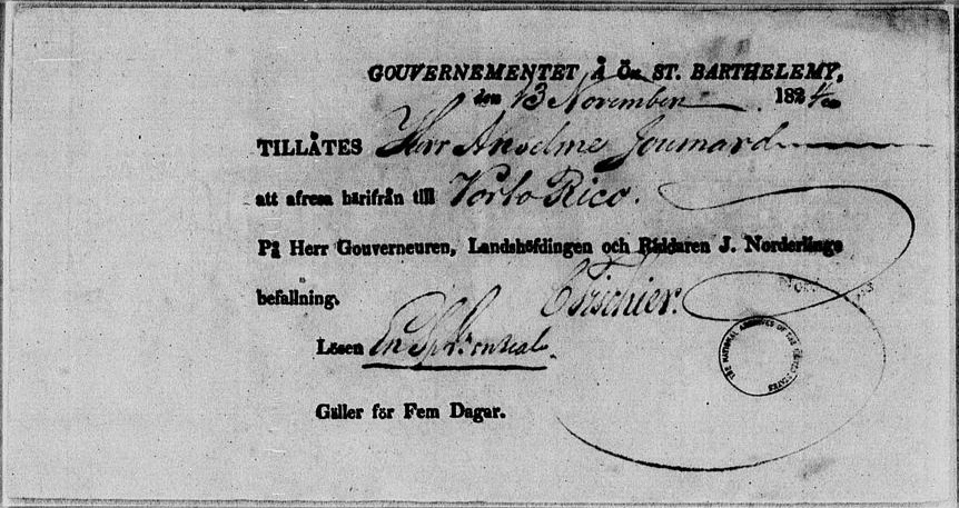 Jean Baptiste Anselme Joumard fait la demande d’une carte de domicile le 29 novembre 1824. Il est arrivé à Patillas le 16 en provenance de Saint-Barthélemy.