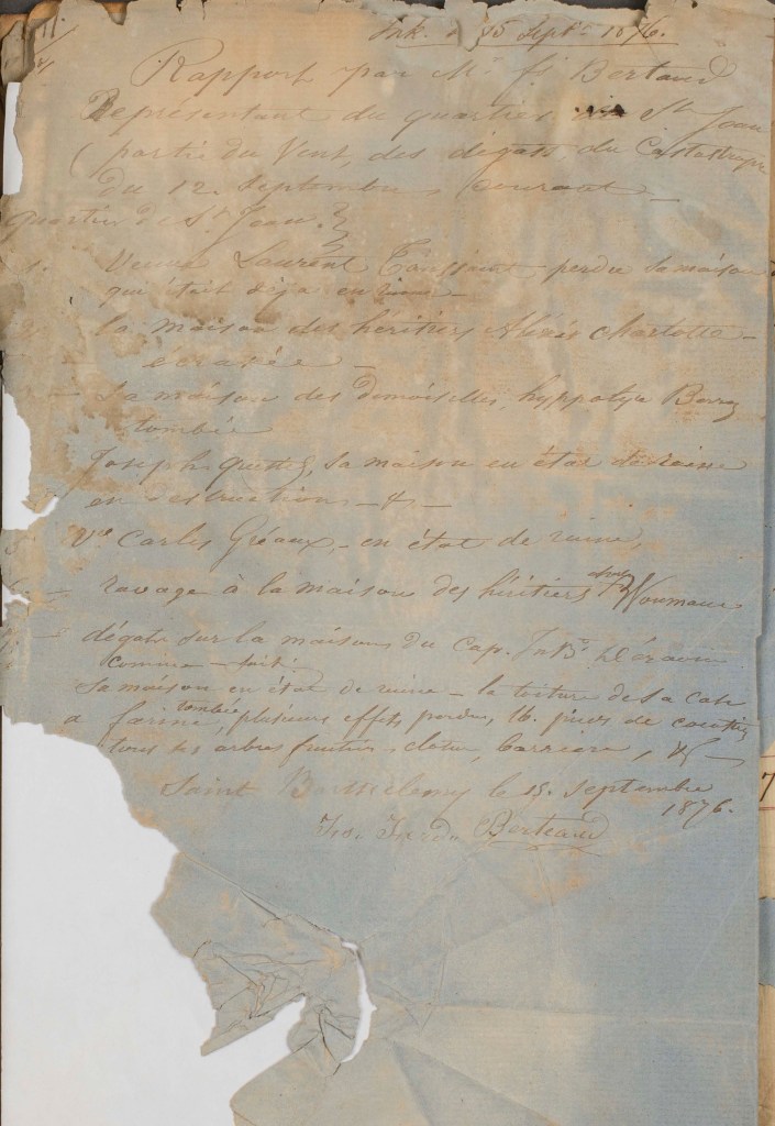 Rapport par M. François Berteau, représentant du quartier de St Jean (partie du vent) des dégâts catastrophiques du 12 septembre courant – Quartier de St Jean :