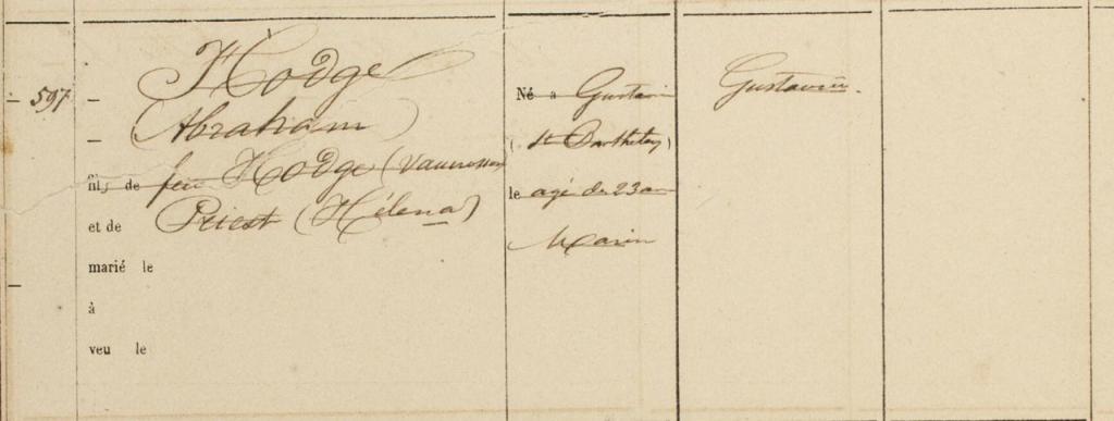 On le trouve donc sous Abraham Hodge, né à Gustavia, âgé de 23 ans, marin, fils de Vaucrosson Hodge et d’Elena Priest.