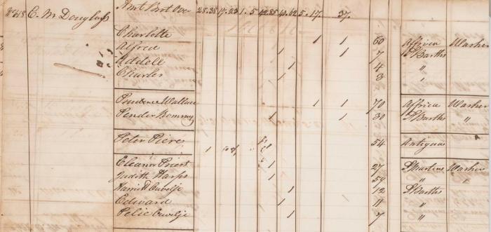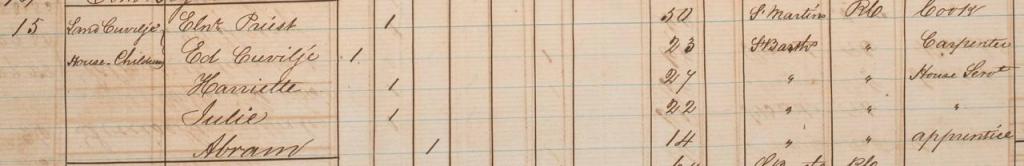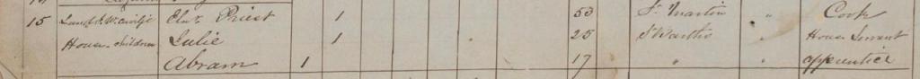 Elle vit dans une maison située sur le lot 618, qui appartient à Charlotte Maria Douglas, épouse du gouverneur James Harlef Haasum. Elle est âgée de 27 ans, née à Saint-Martin et elle est dite blanchisseuse. Elle vit avec sa mère Judith, âgée de 54 ans, blanchisseuse, et native de Saint-Martin. Je pense qu’on y retrouve également son père, même si le nom est mal orthographié : Peter Piere. Il est âgé de 54 ans et originaire d’Antigua. Avec la famille, vivent Harriett Cuvelje, 12 ans, Edward Cuvelje, 11 ans, et Julia Cuvelje, 7 ans. Ce sont les trois enfants que Helen Priest a eus avec John William Cuvelje, musicien et domestique du gouverneur, né à Gustavia vers 1824.