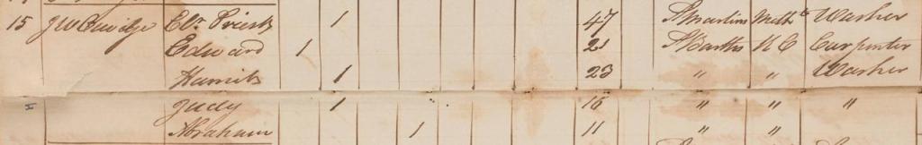 On peut tout de suite noter que l’entrée est barrée … forcément, on retrouve Abraham sous le patronyme Priest un peu plus loin, me direz-vous. Sûrement aussi que le releveur avait les bonnes infos et s’est laissé aller avant de se rendre compte que cela pouvait poser des problèmes. C’est d’autant plus évident qu’aucun des autres Hodge présents dans ce recensement (au-dessus et en dessous) n’a de relation de parenté avec lui.