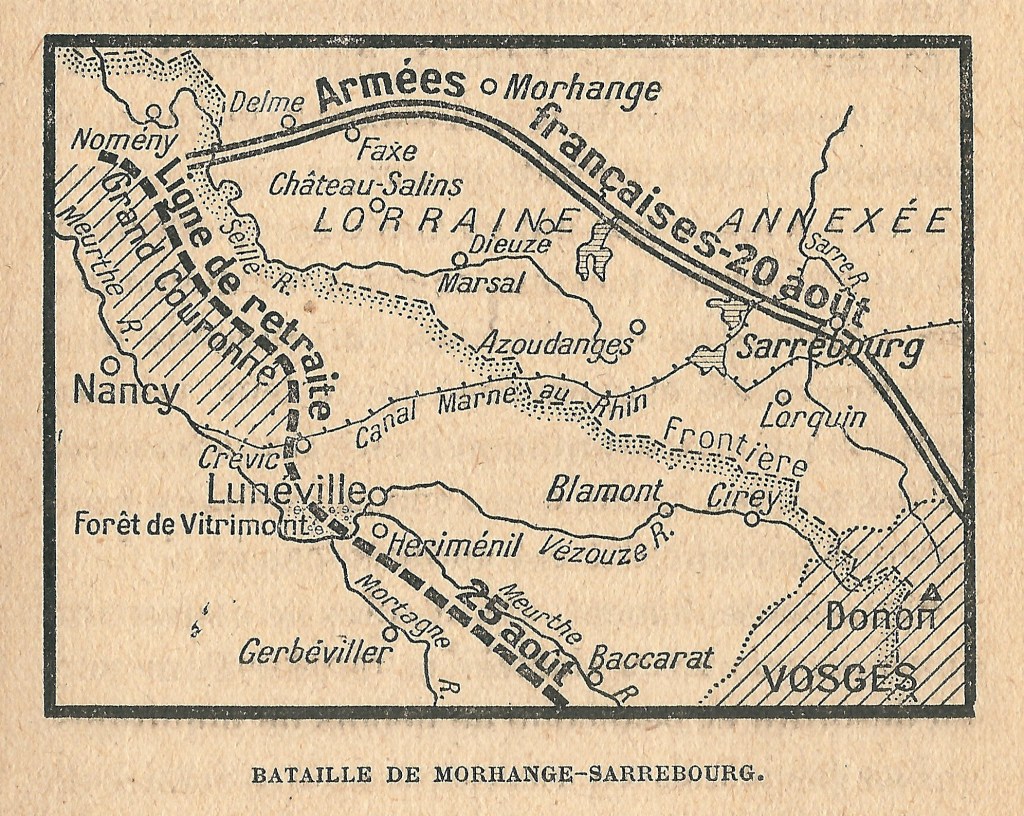 Joseph Querrard était soldat au 4e bataillon de chasseurs à pied, mon arrière-grand-père, caporal au 37e régiment d’infanterie. Ces deux unités font partie de la 11e division d’infanterie, la presque légendaire « Division de Fer », elle-même intégrée au 20e corps d’armée, lui-même rattaché à la 2e armée du général de Castelnau. La division de fer est constituée de quatre régiments d’infanterie et de deux bataillons de chasseurs à pied, tous stationnés à Nancy, Saint-Nicolas-de-Port et Saint-Dié. C’est, pour ainsi dire, une « division lorraine ». À compter du 19 août, le 4e BCP est mis à la disposition du chef de corps du 37e RI. Les deux unités vont donc combattre ensemble, côte à côte, pendant cette bataille.
