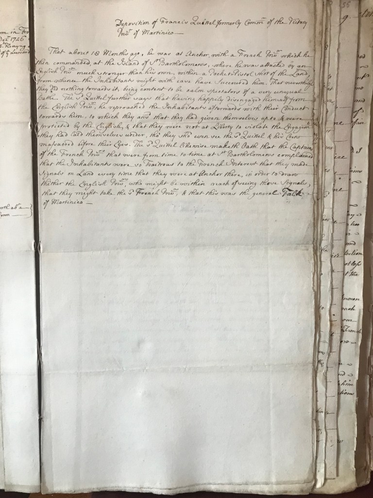 « Il y a environ dix-huit mois, alors qu’il était à l’ancre sur un navire corsaire qu’il commandait à l’île de Saint-Barthélemy, il avait été attaqué par un corsaire anglais bien plus fortement armé que le sien. Il se trouvait à distance d’un coup de pistolet du rivage, d’où les habitants auraient pu lui venir en aide. Néanmoins, ils ne firent rien pour lui, se contentant de rester spectateurs d’une drôle de bataille. Il dit qu’il avait réussi à se dégager de l’attaque et que, plus tard, alors qu’il reprochait aux habitants leur conduite envers lui, ils lui avaient répondu qu’ils avaient un accord avec les Anglais et qu’ils les protégeaient. Qu’ils ne pouvaient pas violer leurs engagements, même en voyant Questel et son équipage se faire massacrer devant eux. Le capitaine Questel ajoute que les corsaires français, qui passaient de temps en temps à Saint-Barthélemy, se plaignaient que les habitants étaient des traîtres aux intérêts français, que les habitants faisaient des signaux de fumée à chaque fois qu’ils arrivaient pour faire venir les corsaires anglais, et que c’est ce que les gens disaient à la Martinique ».