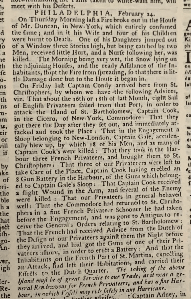 Par exemple, un groupe de corsaires britanniques a de nouveau saisi Saint-Barth en 1757, une attaque sur laquelle je travaille encore.