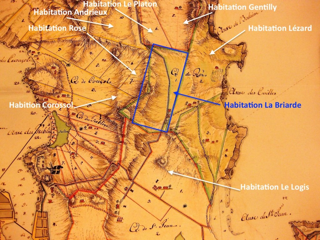 Dans le livret suédois « Examen des terres » de mars 1787, qui donne une description détaillée de toutes les habitations de l’île, on trouve, au Quartier du Roy, l’habitation « La Briarde ». Elle appartient à Robert Gréaux, et mesure cinq carrés. Elle est bordée au nord par l’habitation « Lézard », à l’est par l’habitation « Le Logis », au sud par les habitations « Rose » et « Corossol », et à l’ouest par les habitations « Le Platon », « Gentilly » et « Andrieux ». Le sol est bon et plat dans les parties nord et est, le reste est sec et pierreux. La plus grande partie de l’habitation est consacrée à la culture de vivres et de coton (environ 4 balles produites). Il y a deux maisons sur cette propriété, et elle est habitée par treize personnes blanches et un esclave. Il y a douze chèvres, une vache, et deux jeunes bœufs.
