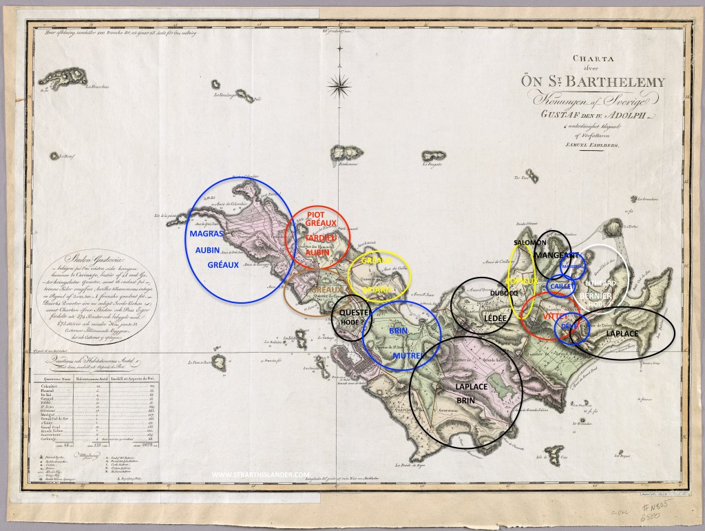 Ci-dessous, une tentative de localisation des premiers habitants de notre île, juste avant 1700. On ne doit pas être bien loin de la vérité, même s’il est difficile d’avoir des certitudes absolues. Par exemple, quelles sont les familles qui vivent à Grand-Fond ? Les Laplace sont-ils déjà installés à Lorient ? Est-ce qu’on trouve des Gréaux à Saint-Jean ? Des Questel à Saline ?